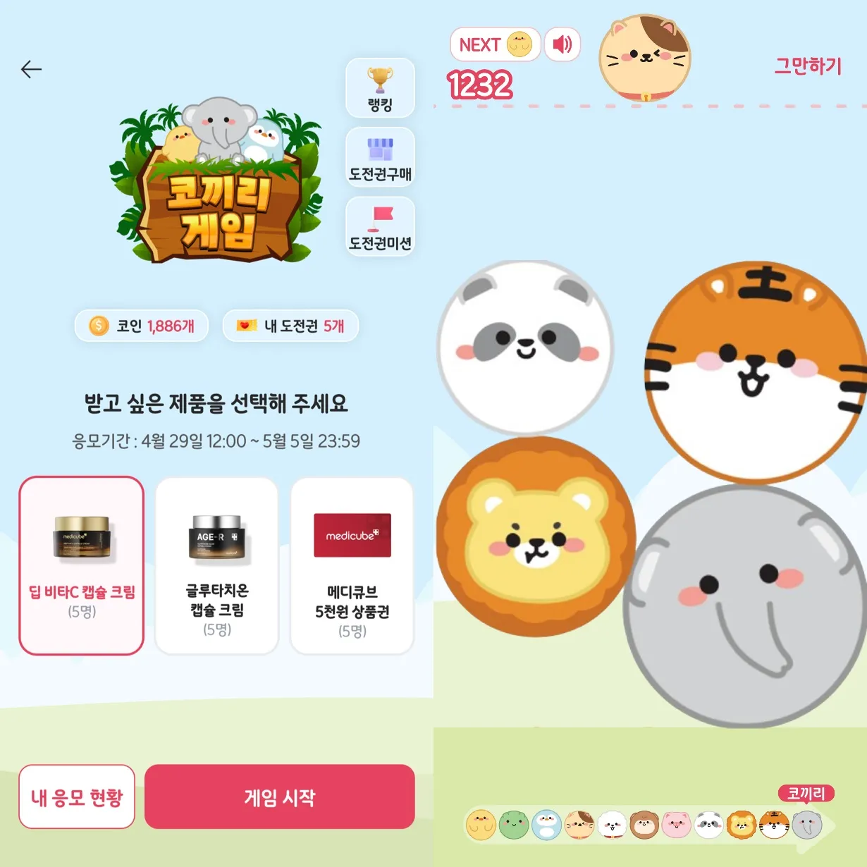 🐘 코끼리 게임 : 집중력 테스트! 높은 점수를 기록하면 추첨을 통해 메디큐브 제품을 받을 수 있는 응모권이 주어져요!
