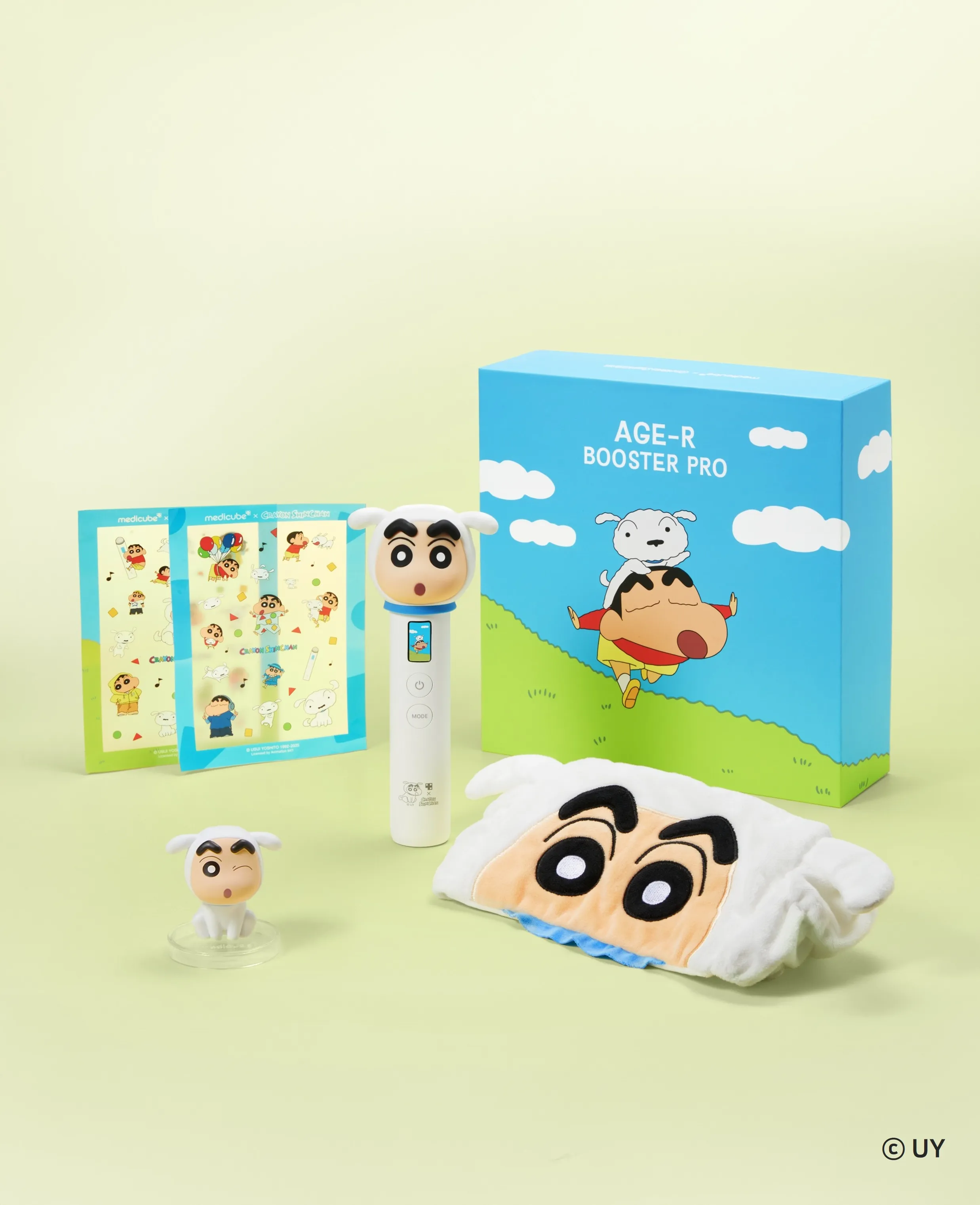 메디큐브 에이지알의 대표 뷰티 디바이스 ‘부스터 프로’와 ‘부스터 프로 미니 플러스’ 역시 짱구 캐릭터 디자인을 적용한 특별 한정판으로 새롭게 출시된다. ‘부스터 프로’의 헤드케이스와 본체, 패키지 전반에 짱구 일러스트를 입혀 유쾌한 감성을 더했으며, 구매 시 짱구 스티커 2종, 흰둥이 옷을 입은 짱구 피규어, 짱구 세안 밴드로 구성된 특별 구성이 함께 제공된다.